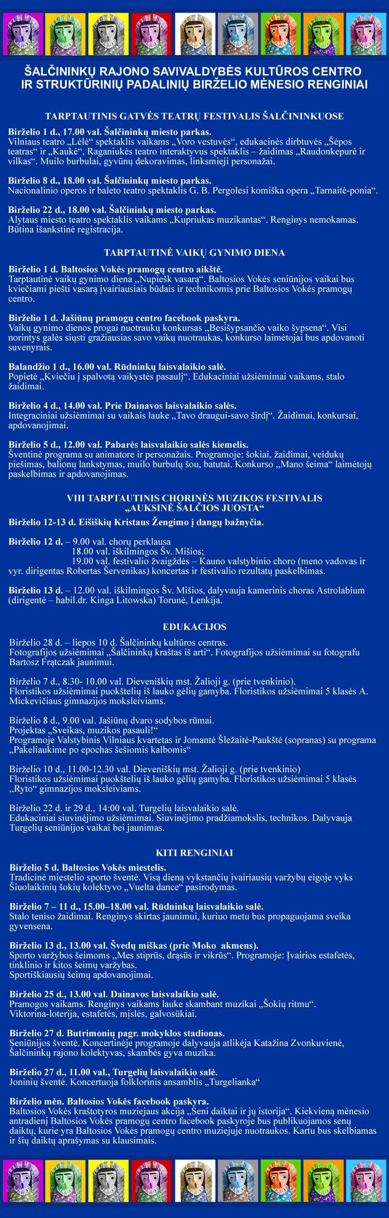 2021 m. birželio mėnesio renginiai Post published:2021-06-07 You Might Also Like Kalėdų eglės įžiebimas 2024-11-20 Filmas „Kakė Makė: mano filmas” 2023-04-11 Užgavėnių mugė Šalčininkuose 2026 2026-01-14