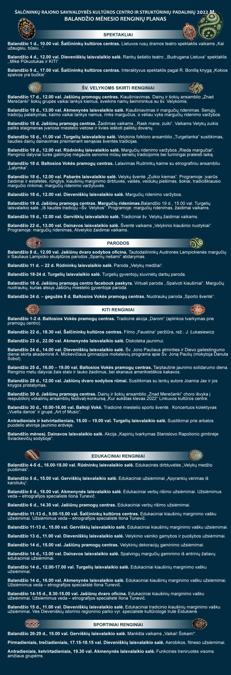 2022 m. balandžio mėnesio renginiai Post published:2022-03-30 You Might Also Like Sveikiname su Tarptautine kultūros diena! 2021-04-15 Filmas ŠEIMA 2023-10-25 Sveikiname artėjančių švenčių proga 2024-12-23