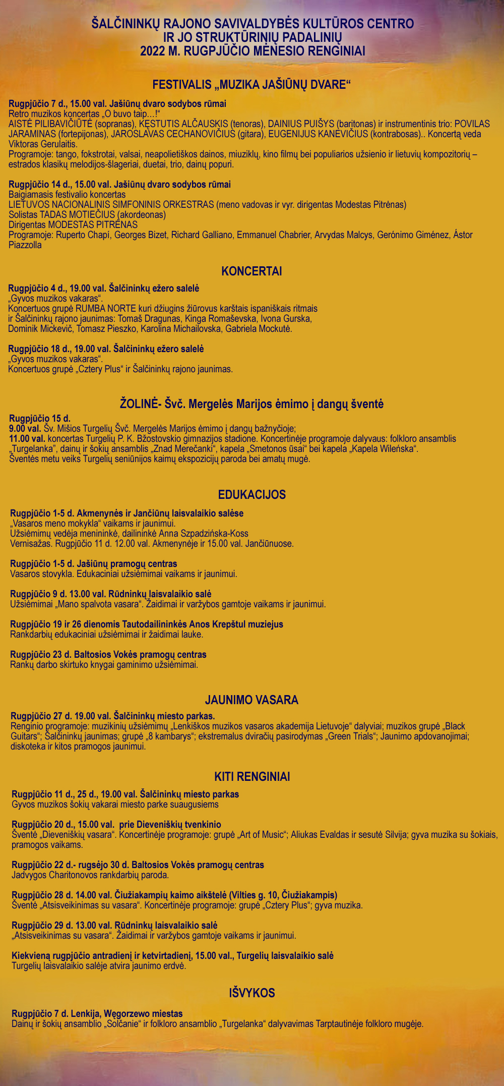 2022 m. rugpjūčio mėnesio renginiai Post published:2022-08-03 You Might Also Like Parodos „XIX a. muzikinio ir teatrinio gyvenimo atspindžiai iš Lietuvos teatro, muzikos ir kino muziejaus rinkinių“ pristatymas 2021-08-23 Keistuolių teatro spektaklis „HOP!” 2021-12-03 Derliaus šventė – pasidžiaukime bendryste! 2025-09-15
