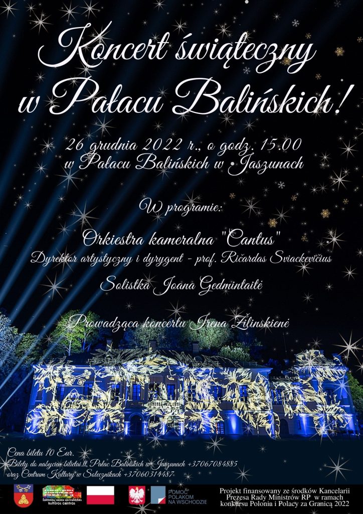 Bilety do nabycia na stronie bilietai.lt, w Pałacu Balińskich w Jaszunach +37067084885 i w Centrum Kultury w Solecznikach +37060314487.