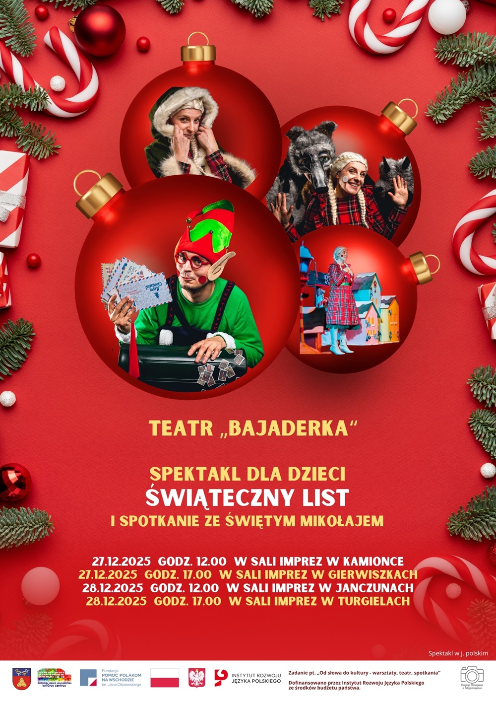 Centrum Kultury Samorządu Rejonu Solecznickiego zaprasza na spektakl „Świąteczny list” Teatru Bajaderka, który zostanie zaprezentowany w filiach Centrum Kultury. Spektakle odbędą się: 27.12.2024 o godz.12.00,