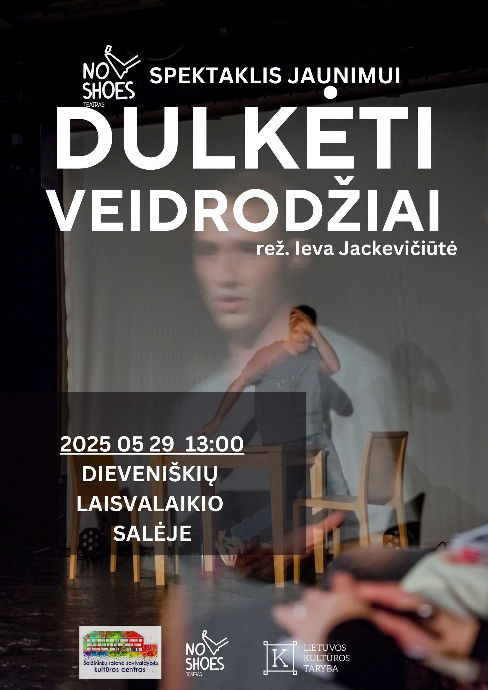 DULKĖTI VEIDRODŽIAI 2025.05.29 13.00 Dieveniškių laisvalaikio salė Rekomenduojamas amžius: nuo 14 m. Režisierė: Ieva Jackevičiūtė Aktorius ir dramaturgas: Raimondas Klezys Video anonsas: https://vimeo.com/1006168480 Recenzija: https://www.7md.lt/teatras/2020-07-10/Paribiu-dramaturgija