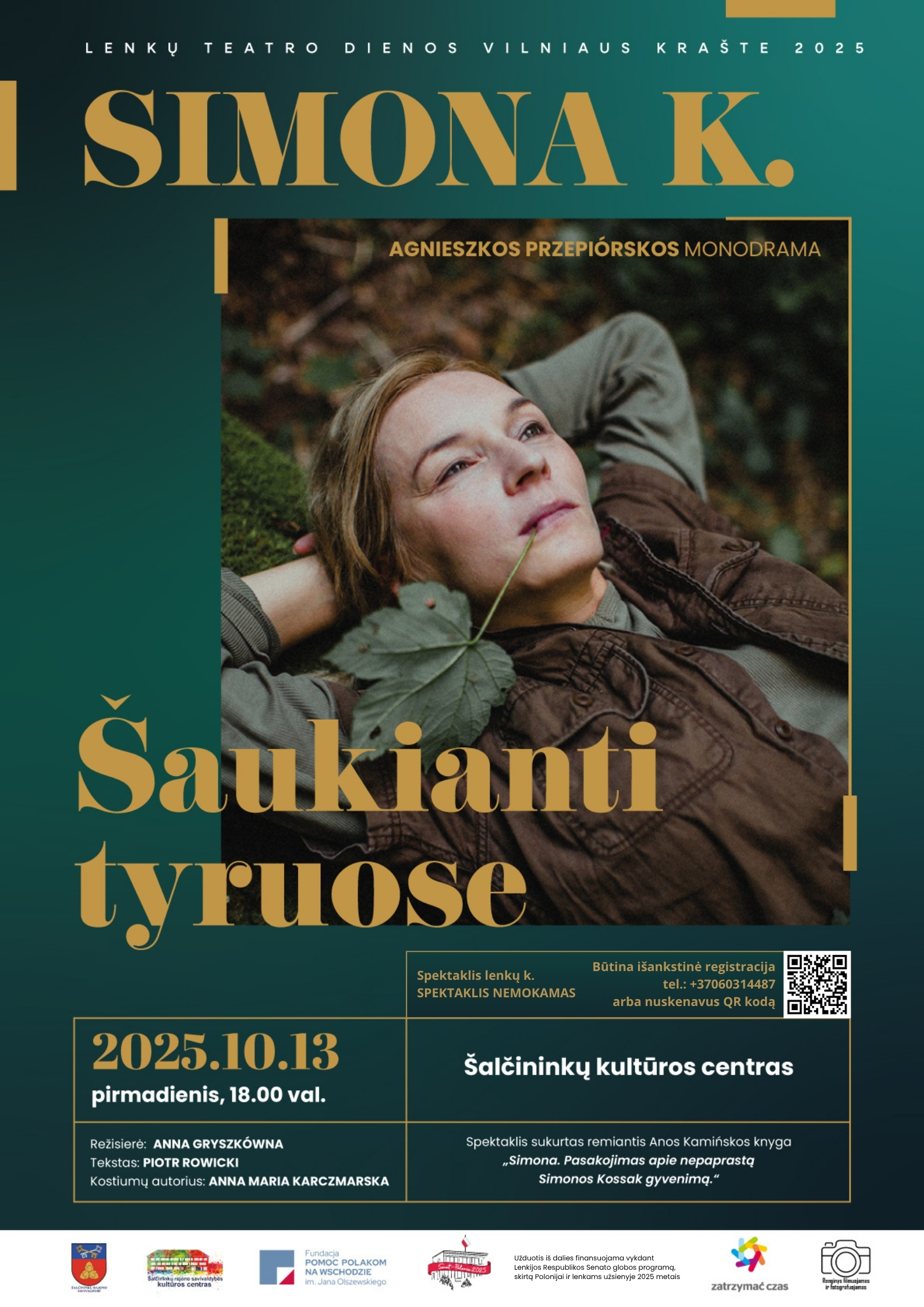 LENKŲ TEATRO DIENOS VILNIAUS KRAŠTE 2025Spalio 13 d., pirmadienį, 18.00 val.Šalčininkų kultūros centre AGNIESZKOS PRZEPIÓRSKOS MONODRAMA„SIMONA K. ŠAUKIANTI TYRUOSE” Režisierė: Anna GryszkównaTekstas: Piotr RowickiKostiumų autorius: Anna Maria